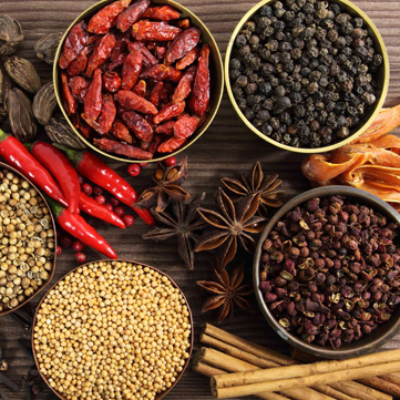 Spices A rich variety of whole and ground spices including black pepper, cumin, cardamom, tumeric, cinnamonand cloves sourced from regions known for their superior quality.